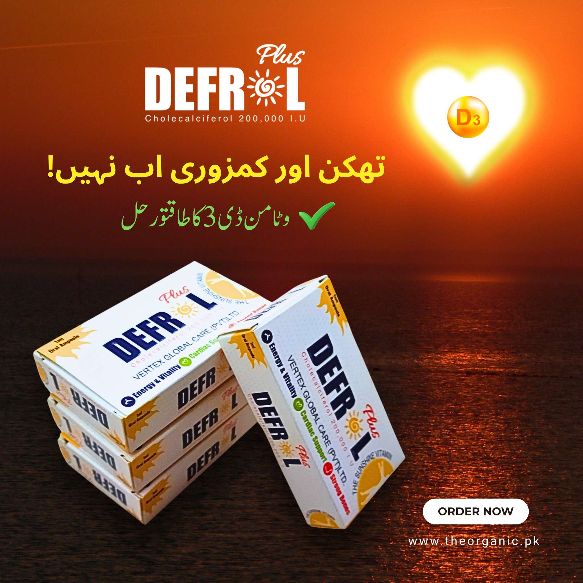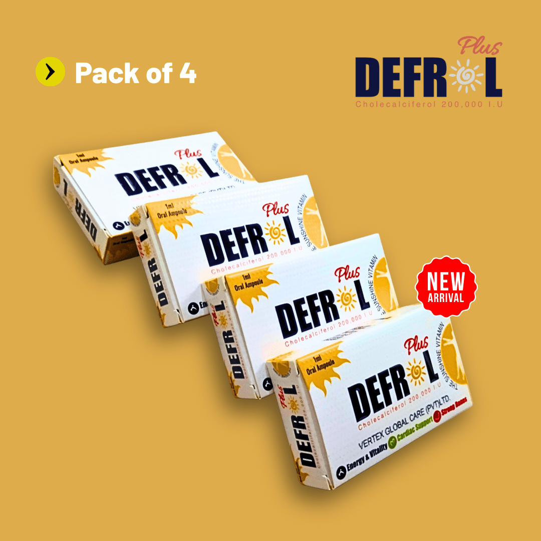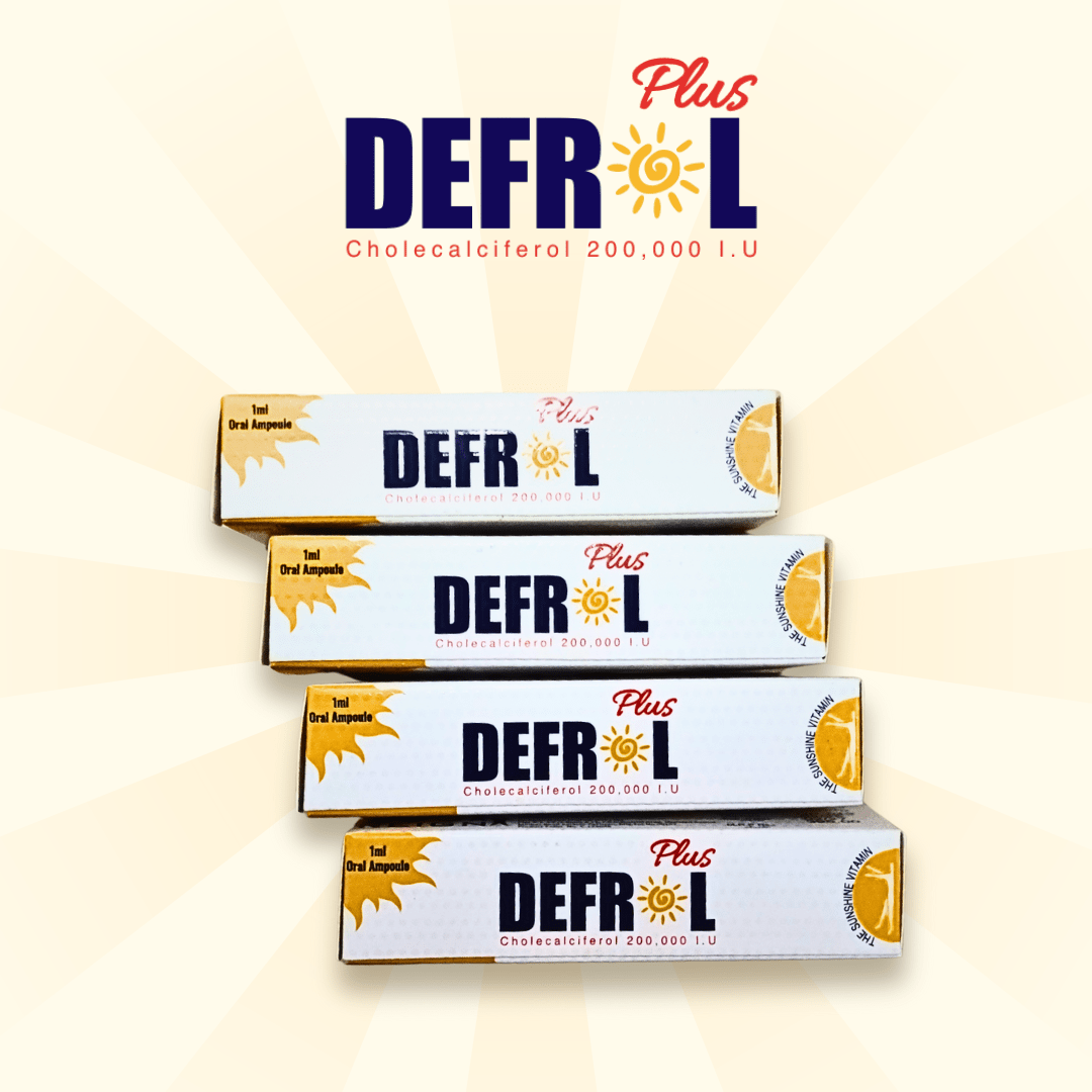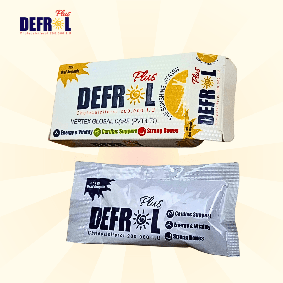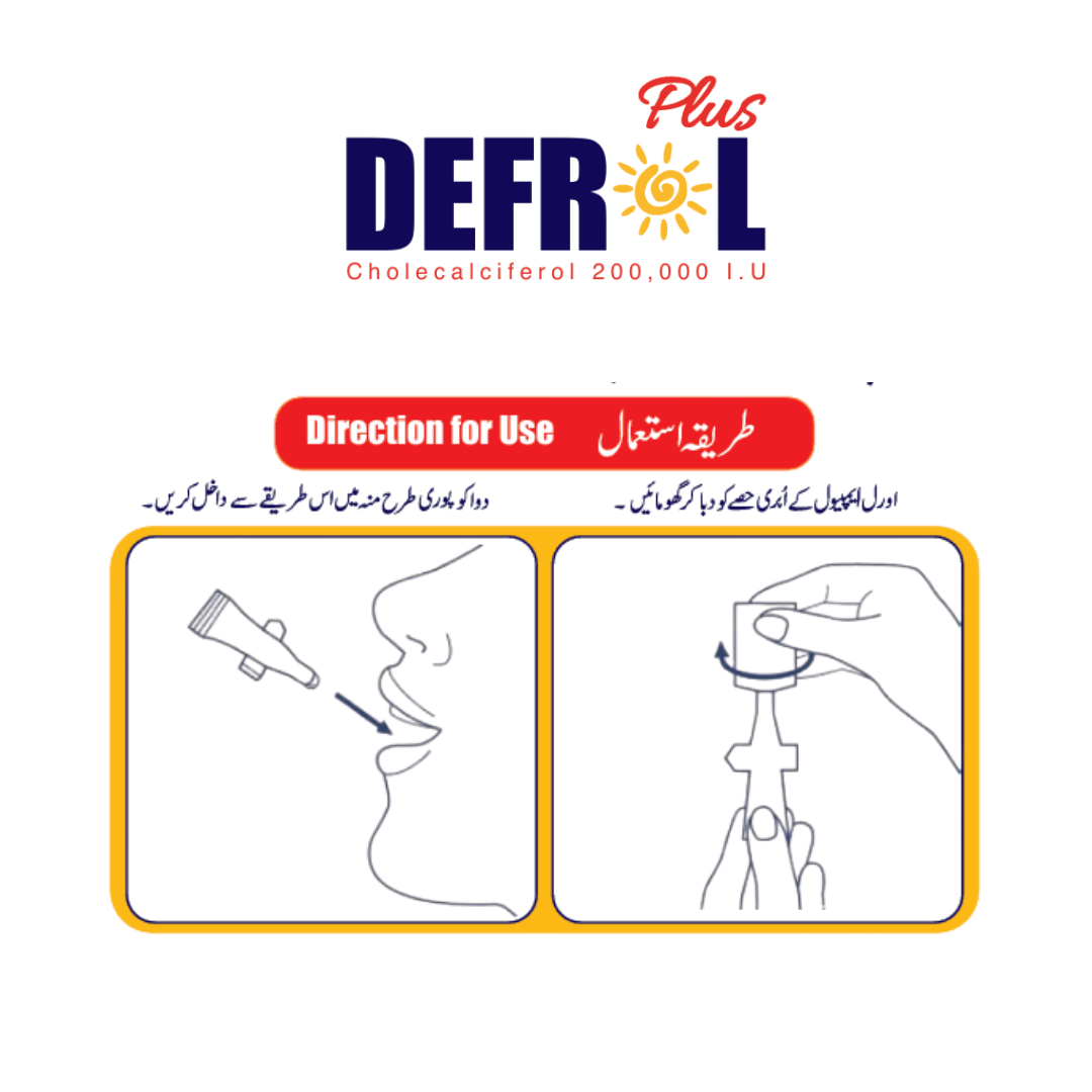 Defrol Plus is a high-potency Vitamin D3 supplement in the form of oral ampoules, each containing 200,000 IU of Cholecalciferol (Vitamin D3 USP). Specially formulated to support bone health, cardiac function, and overall energy and vitality, Defrol Plus helps in the prevention and treatment of Vitamin D deficiency, which is common due to limited sun exposure or poor dietary intake. Vitamin D3 plays a key role in calcium absorption, making it essential for strong bones and a healthy immune system. This product is ideal for individuals suffering from fatigue, weak bones, or low immunity levels. It is safe to use during pregnancy and breastfeeding under medical guidance. Manufactured by Reign Nutro Pharma in Pakistan, Defrol Plus is recommended by healthcare professionals and is presented in easy-to-use 1ml oral ampoules. For best results, use only as directed by your physician.